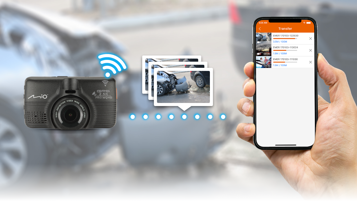 For Mio’s dash cams, a Wi-Fi connection over a mobile hotspot does not mean Internet access. By device-to-device connections over Wi-Fi, direct transmission is established between the mobile phone and the dash cam. The video files are transmitted over this method, so the data transfer does not rely on the mobile device’s 3G/4G/5G traffic. Therefore, data transfers are free of charge, with a concept similar to a Bluetooth paired transmission.