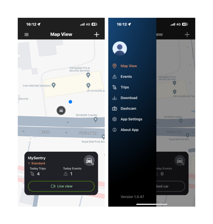 The homepage map displays the real-time location and connection status of your MiSentry™ Smart Dash Cam. Simply pick up your mobile phone to track your car's location remotely, browse driving records, and adjust settings easily.