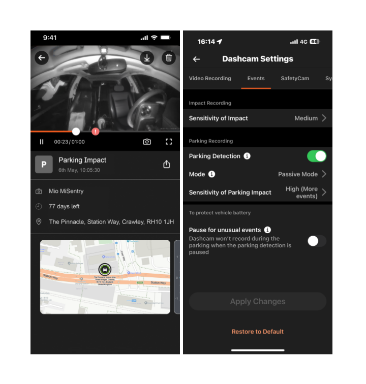 - Parking Mode Impact Detection (triggered by the g-sensor): In the event of a collision, receive immediate push notifications and have the recording automatically locked and uploaded to the cloud for safekeeping. You can also remotely access and review event recordings instantly via the App.