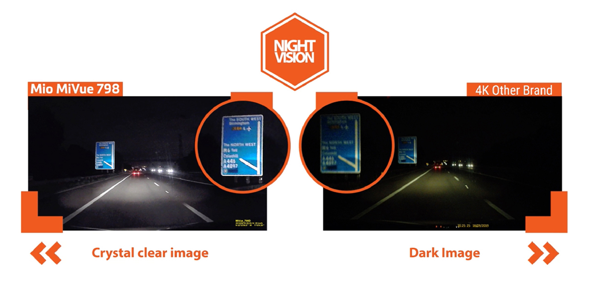 Pay attention to the dash cam on the left - equipped with Sony’s premium STARVIS sensor. You can see the image quality of Mio’s STARVIS models can be actually 4 times brighter in low-light environments than cameras with general sensors!