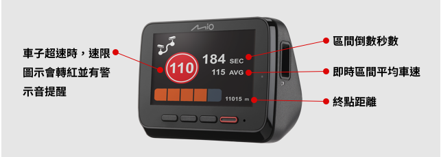 Mio內建 即時超速提醒、安全通過倒數等動態區間測速提醒功能,真正知道是否超速!