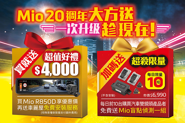 Mio品牌20週年,持續以「前進・永不止息」的理念,堅持引以為傲的創新與品質,提供更優質的產品與服務。 今年11/10~11/13台北資訊月期間,現場推出超殺優惠!購買年度最強電子後視鏡機種及全系列極致畫質行車記錄器產品立即享現場優惠價,指定機種買再送最高總值4000元的超值禮品。同時現場再限量加碼!每日前10台購買汽車雙鏡頭產品的消費者,免費贈送Mio BSD盲點偵測一組(市價6990元)